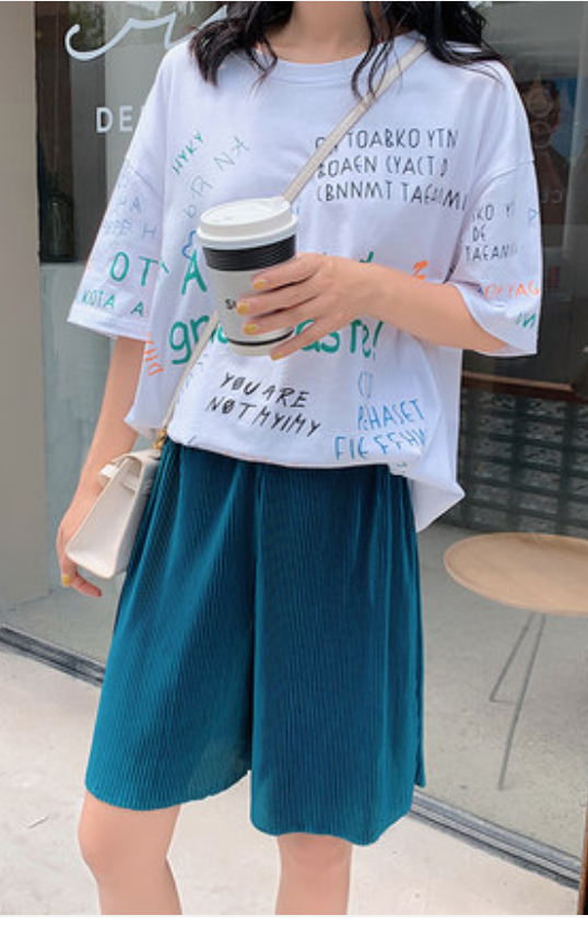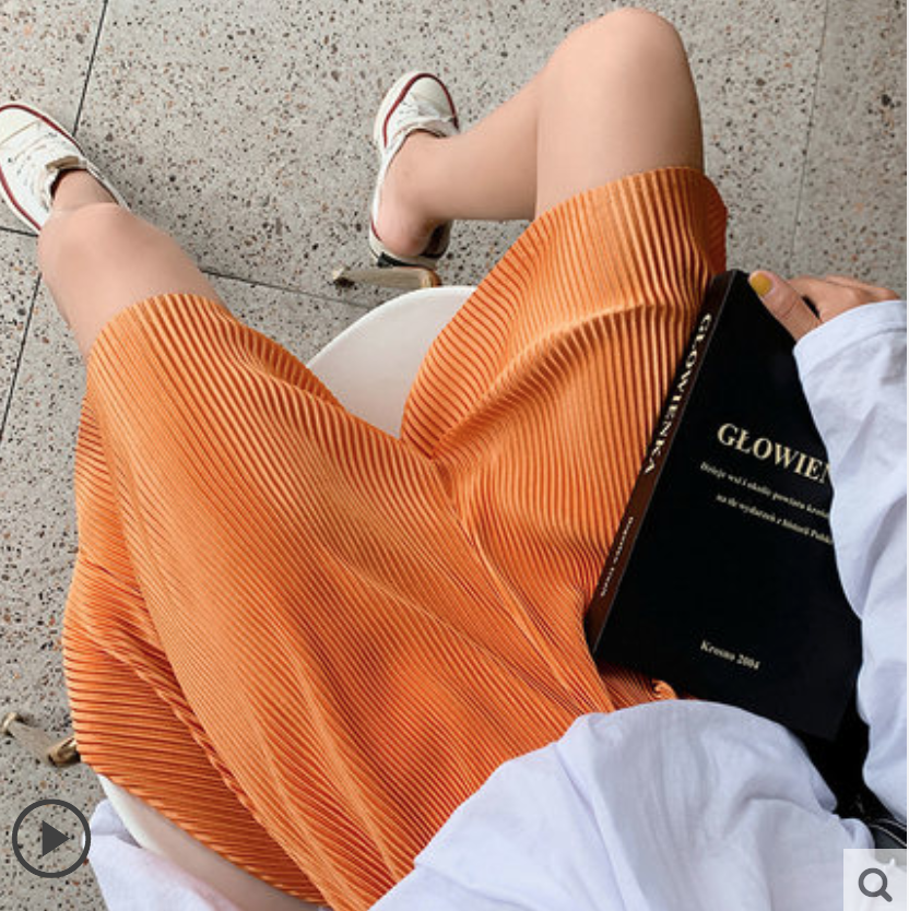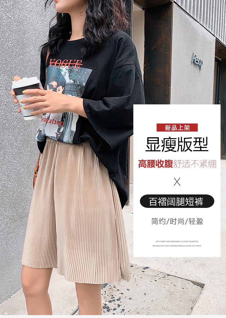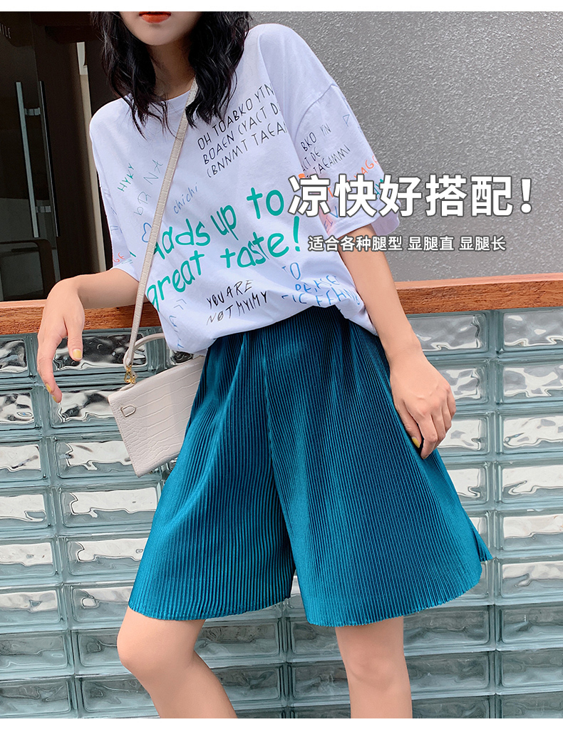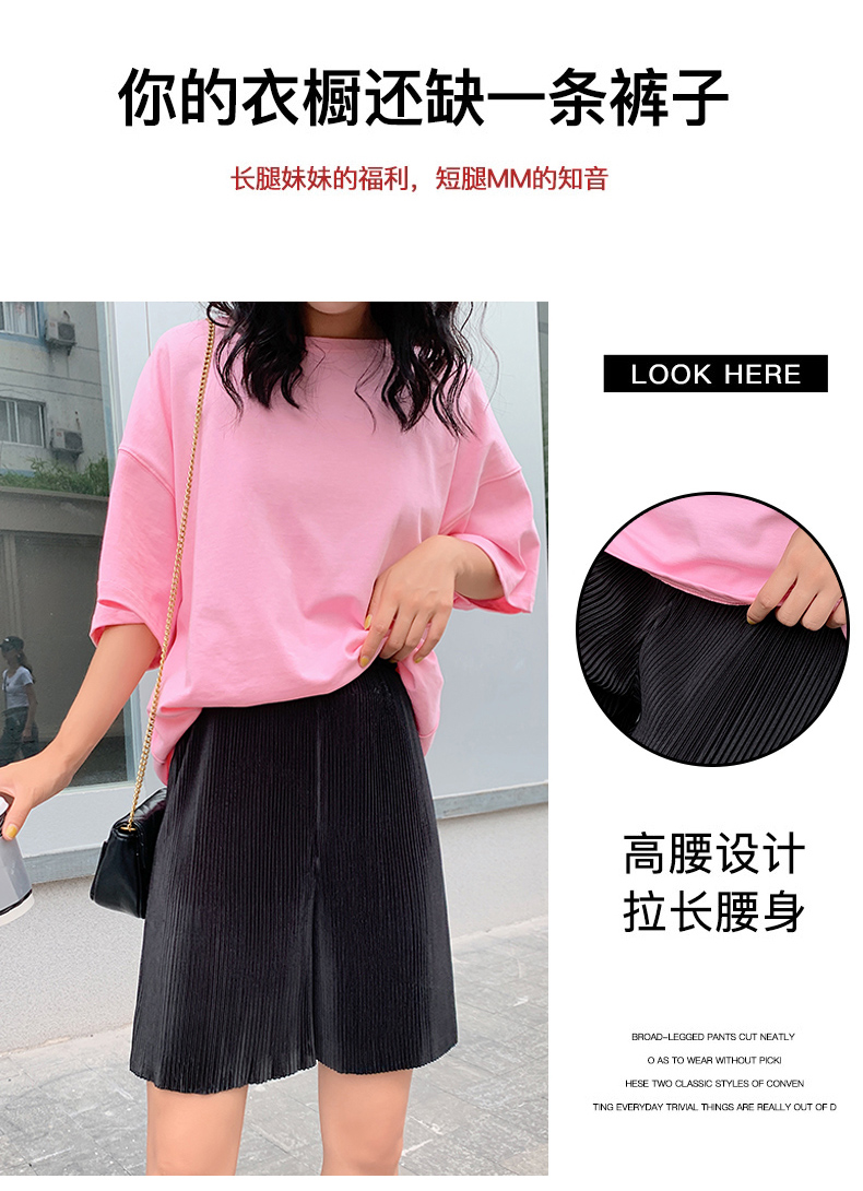 冰絲闊腿五分褲女夏季新款寬松高腰垂感百褶直筒中褲薄款休閒短褲21040101
