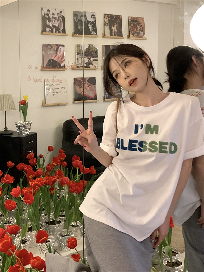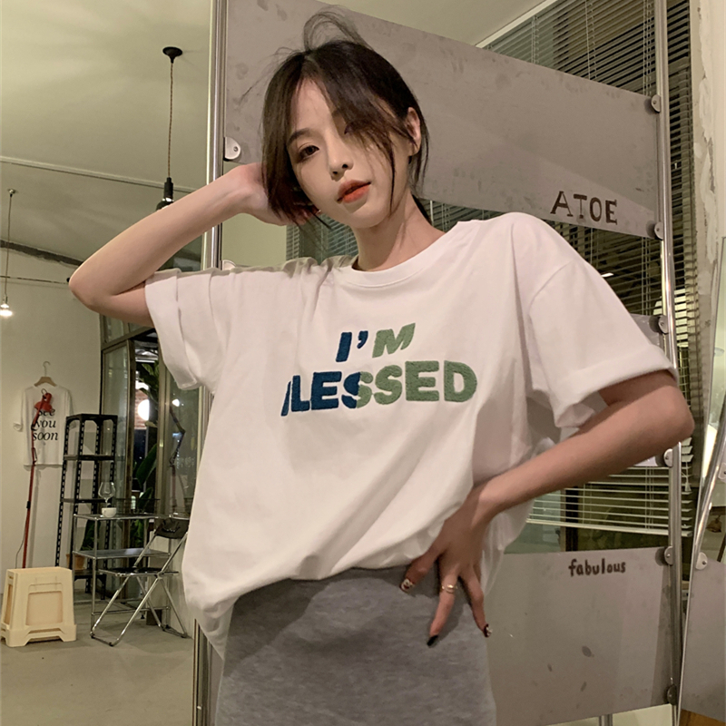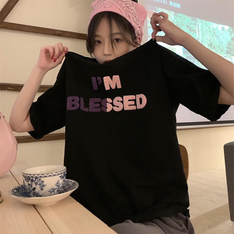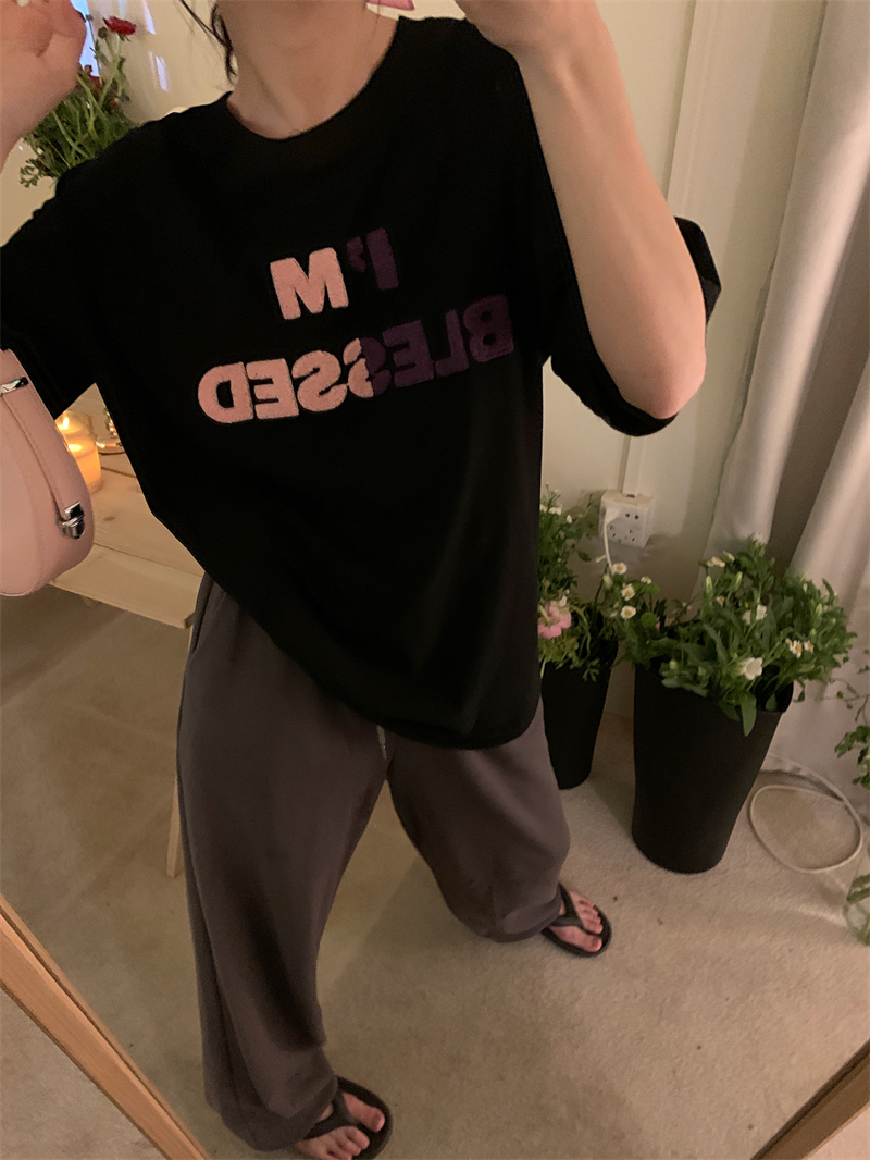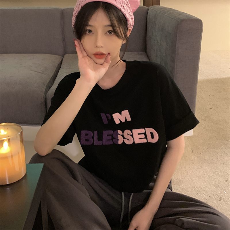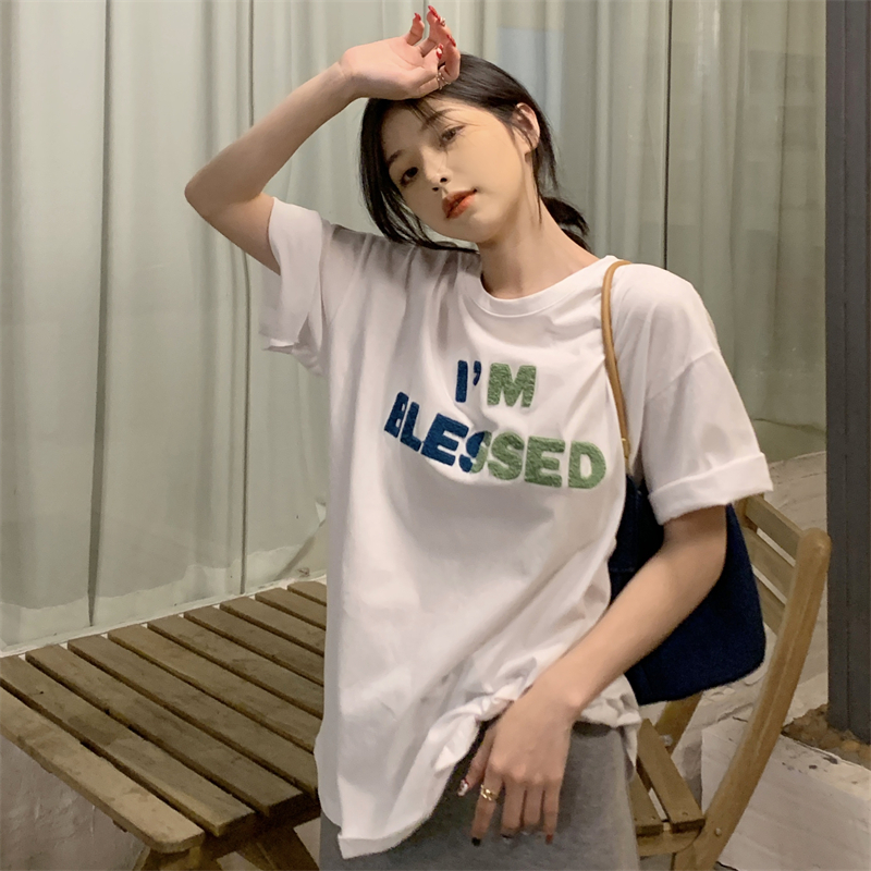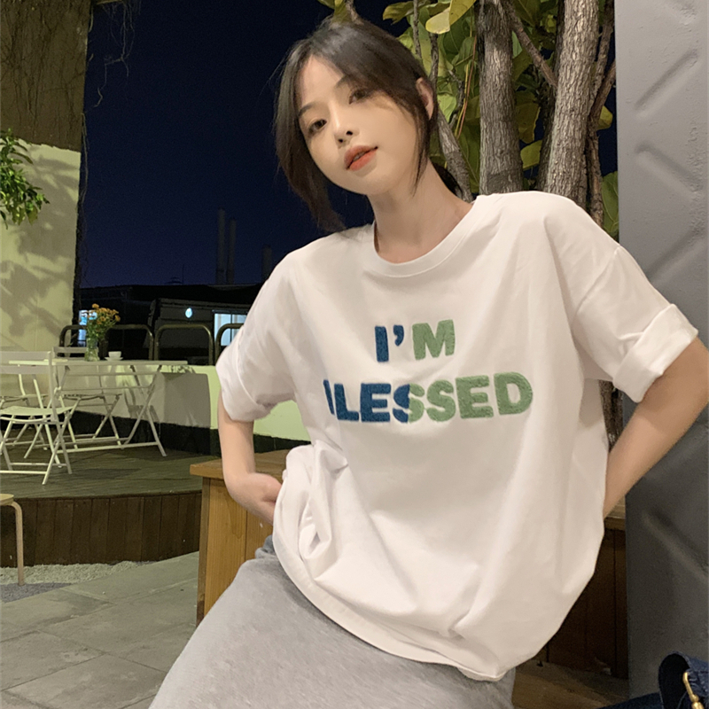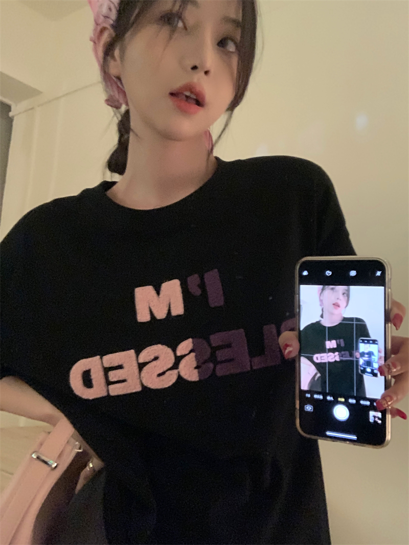粉墨練習生~夏季學院休閒字母植絨設計寬鬆百搭圓領短袖T恤22051906