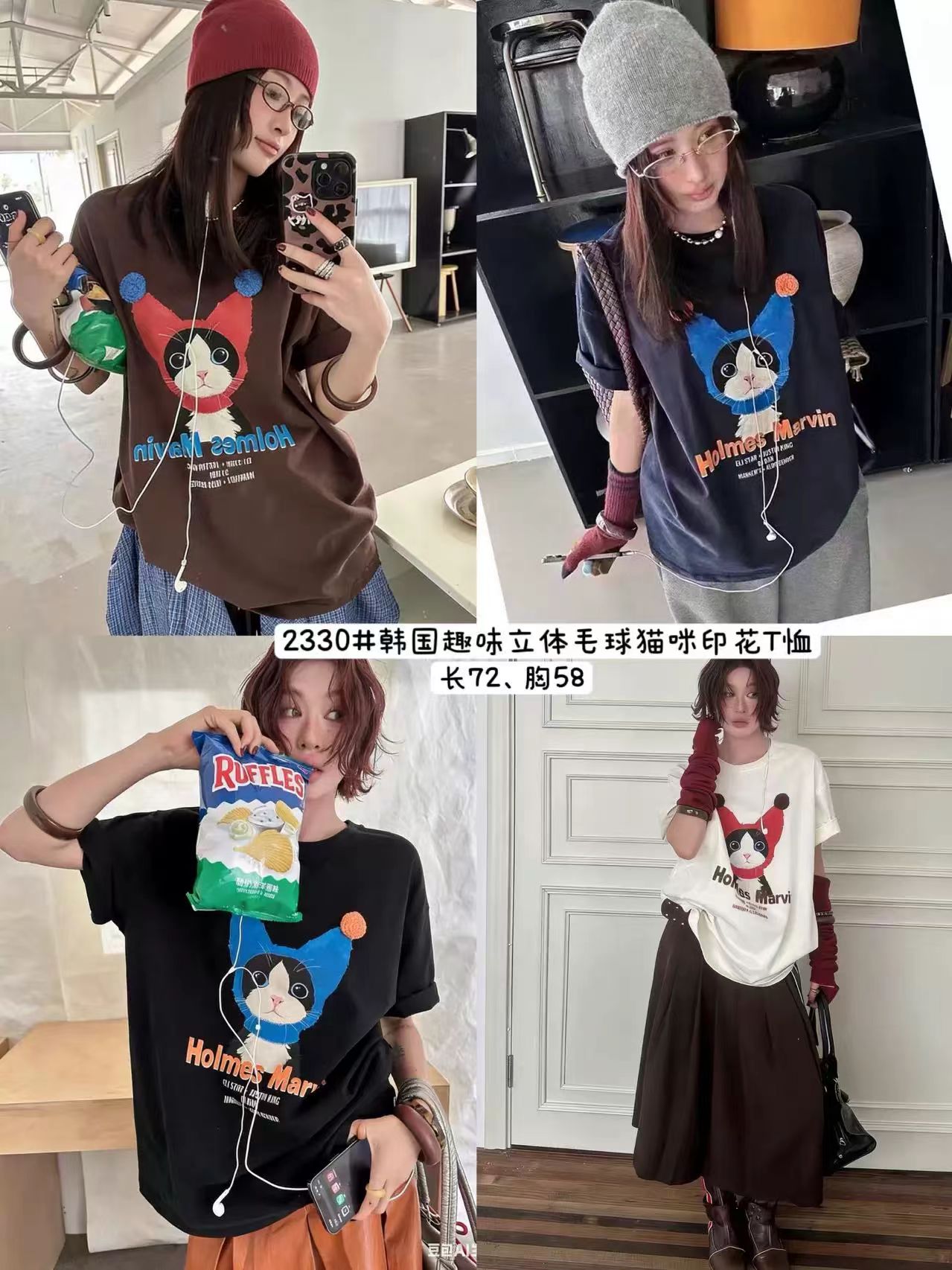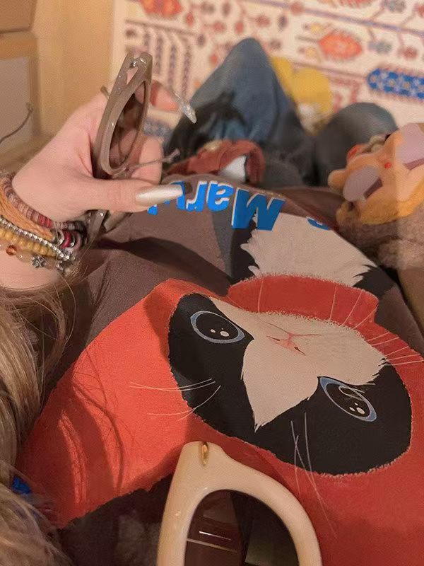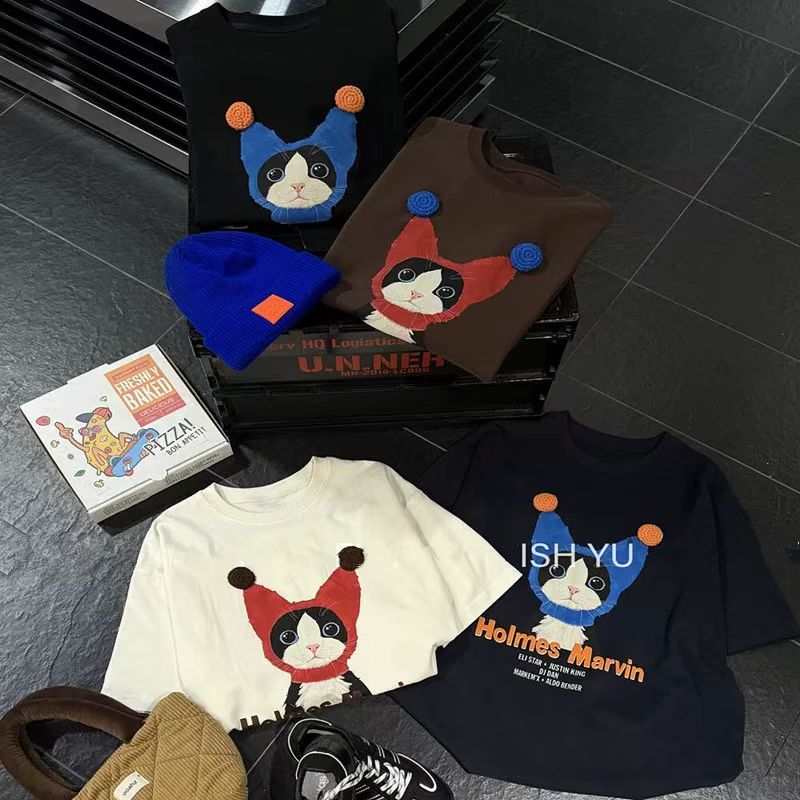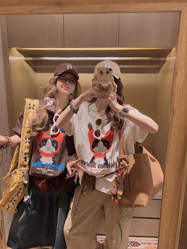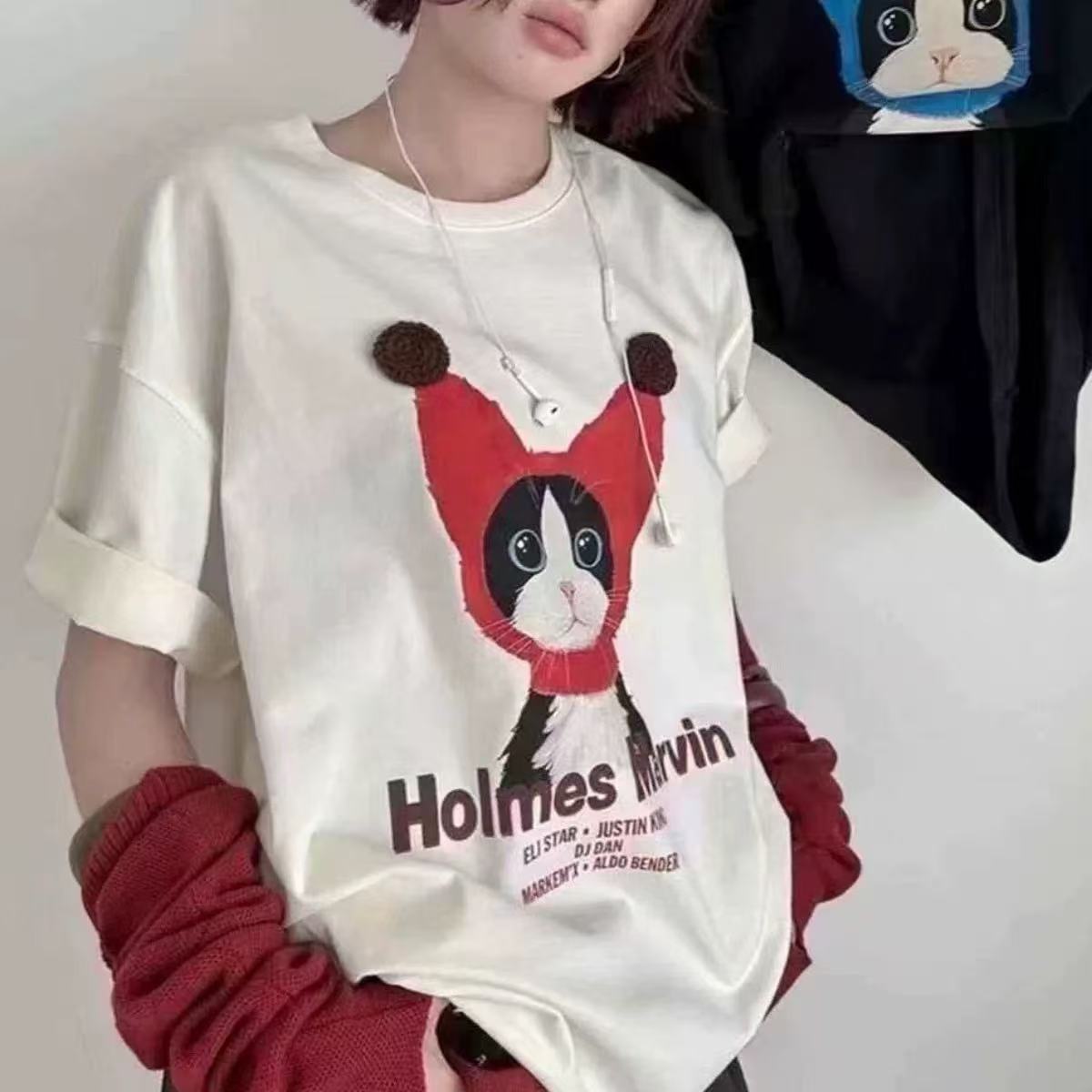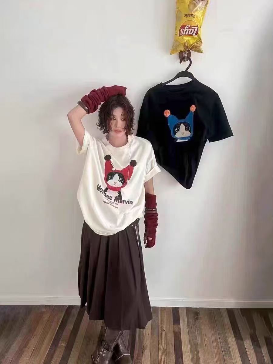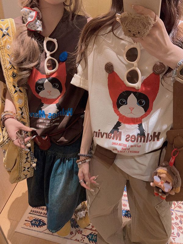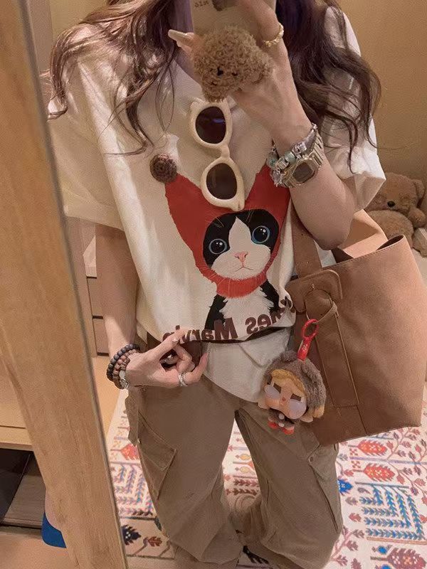 韓系純棉寬松卡通貓咪印花短袖春夏韓風T恤女鬆弛感百搭顯瘦26042501